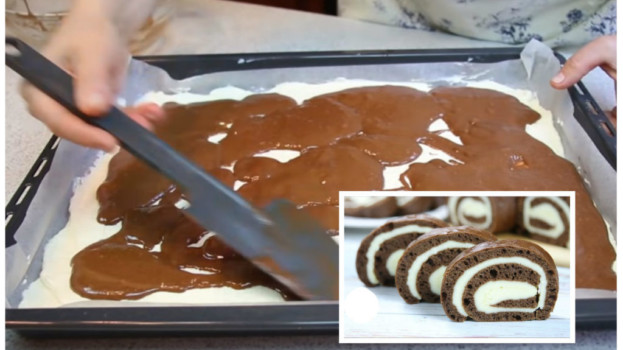Kouzelná čokoládová roláda s tvarohovou náplní: Neděláte zvlášť těsto a krém, vše se peče na 1 plechu!